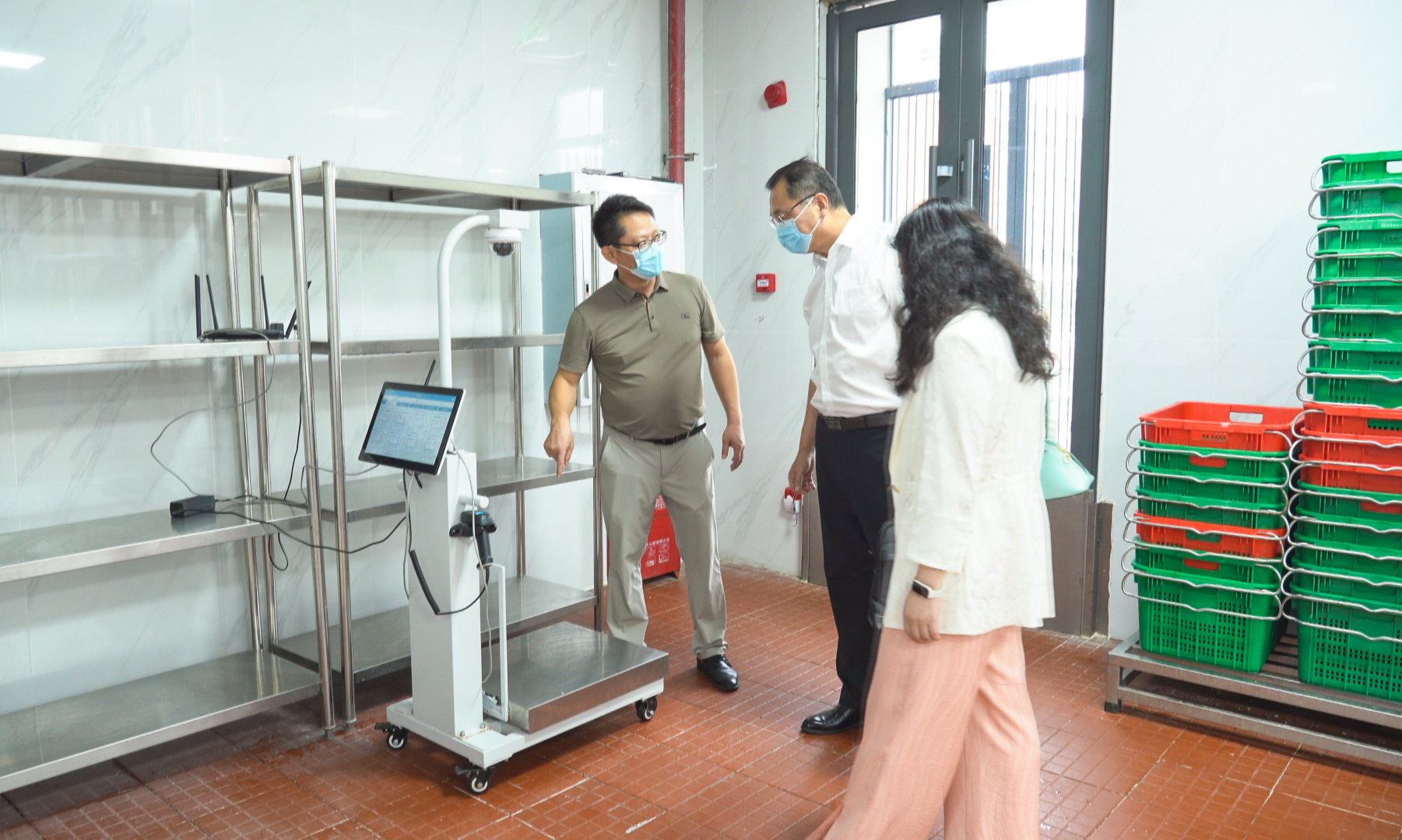 在环城小学,委员们现场观摩了“数字食堂”监管平台的运行情况。食材采购来源、验收单据、库存余量等信息一目了然,智能验收电子秤自动完成称重、拍照、数据上传等全流程,实现“来源可溯、去向可追”。从食材验收标准到操作间卫生状况,从储藏室温湿度管控到餐具消毒流程,委员们详细了解了校园食堂食品安全、膳食经费管理等情况。